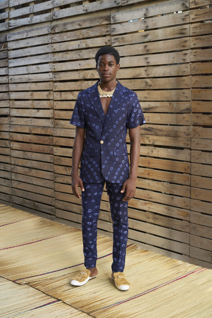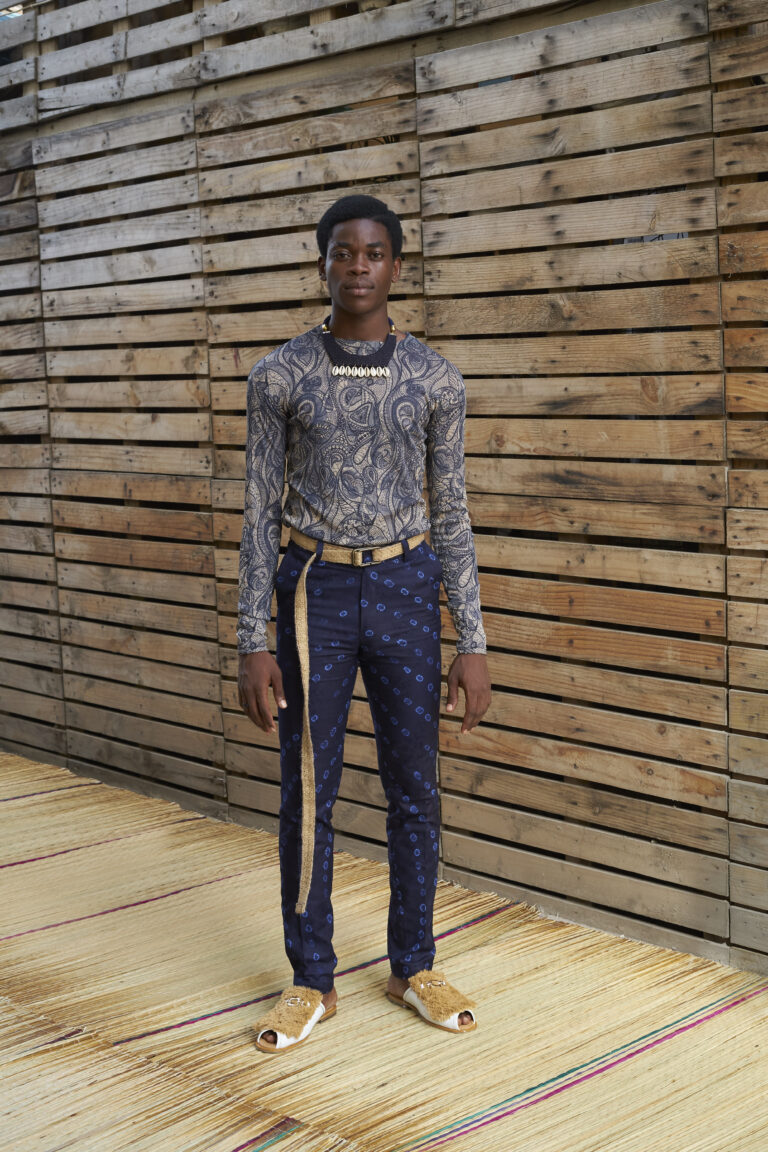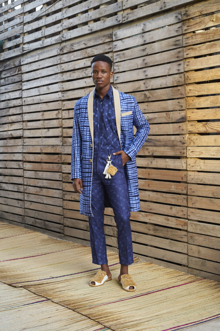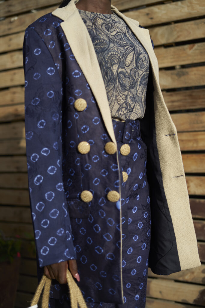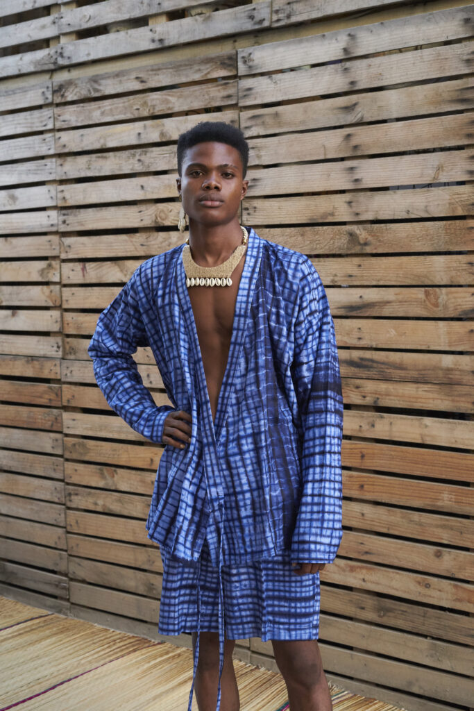 The cuts and selections of fabrics for this collection was inspired by the style and ways of living that reflects their attitudes, habits, tastes, moral standards, socio-economic level, values etc, a reflection of the past, present or future cultures of these people. The collection sports slightly thick and heavy cotton brocade which was hand tied and dyed by some local Guinean artisans based in Ghana to the very soft and flowy silk and cotton fabrics, fleece, spandex, synthetic fur material and leather. This is to show the swings between the diverse ways of clothing and styling amongst the different people in the world, not forgetting my signature material, JUTE which really defines my aesthetic. I have always wanted the chance to promote locally and ethically handmade fabrics, so I used this opportunity to introduce my first locally handmade tie and dye fabric, championing more indigenous fabric with very little use of exotic fabrics this season.
